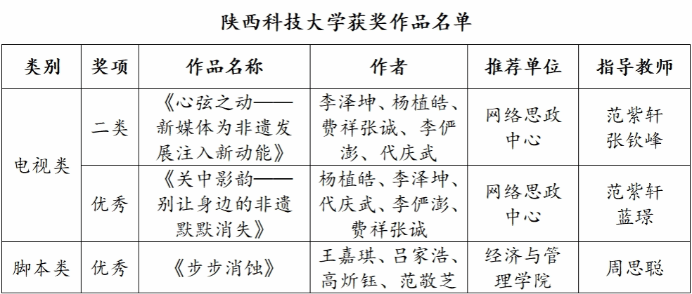 《心弦之動(dòng)——新媒體為非遺發(fā)展注入新動(dòng)能》獲電視類優(yōu)秀作品(高校通道)二類獎(jiǎng)項(xiàng)。作品聚焦新媒體時(shí)代背景下非物質(zhì)文化遺產(chǎn)的傳承與推廣,展現(xiàn)了現(xiàn)代傳播技術(shù)為非遺技藝搭建與公眾溝通橋梁的創(chuàng)新實(shí)踐?!蛾P(guān)中影韻——?jiǎng)e讓身邊的非遺默默消失》獲該賽道優(yōu)秀獎(jiǎng),作品通過富有感染力的鏡頭語言,展現(xiàn)了陜西皮影戲等非遺項(xiàng)目的獨(dú)特魅力,呼吁社會(huì)關(guān)注瀕臨失傳的文化瑰寶。作品《步步消蝕》獲腳本類優(yōu)秀作品(高校通道)優(yōu)秀獎(jiǎng)。該作品通過精巧的構(gòu)思和深刻的內(nèi)涵,揭示了毒品對(duì)青少年身心健康的嚴(yán)重危害,有力地升華了珍愛生命、遠(yuǎn)離毒品的警示主題。