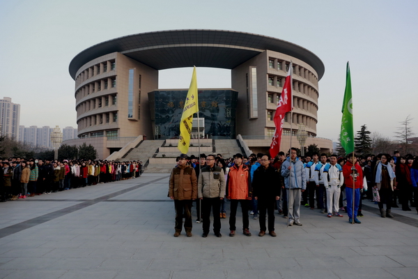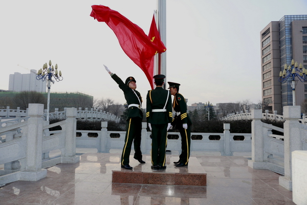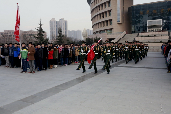清晨,雖然已是數(shù)九寒天,但圖書館南廣場上已經(jīng)聚集了數(shù)千名前來觀禮的師生。7點50分,校國旗護(hù)衛(wèi)隊的隊員們在做最后的著裝整理,雖然已經(jīng)執(zhí)行過幾十次升旗儀式,但在這個特殊的日子,他們還是感到格外緊張。7點55分,50名身穿禮服的國旗護(hù)衛(wèi)隊員邁著矯健的步伐走向旗臺。8點整,伴隨著雄壯的國歌聲和一聲“敬禮”,國旗在半空中劃出了一道美麗的弧線。在場的每一個人臉上都露出了激動的神情。