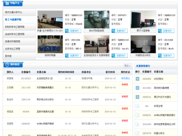 我校大型儀器設(shè)備開放共享系統(tǒng),以提高設(shè)備投資效益為目的,打破了空間限制、地域界限、部門界限,實(shí)現(xiàn)了儀器預(yù)約、實(shí)時(shí)監(jiān)控、設(shè)備維修、在線交流、數(shù)據(jù)統(tǒng)計(jì)等功能,很好的解決了以往我校實(shí)驗(yàn)室管理工作中的各項(xiàng)疑難問題。通過網(wǎng)上預(yù)約管理系統(tǒng),提高了設(shè)備儀器的使用率,有效避免了設(shè)備重復(fù)購置,實(shí)現(xiàn)了實(shí)驗(yàn)室資源開放共享,通過實(shí)驗(yàn)室工作和設(shè)備量化考核,加強(qiáng)并規(guī)范了實(shí)驗(yàn)室建設(shè)和管理,為實(shí)驗(yàn)教學(xué)和科學(xué)研究提供了良好的服務(wù)平臺。