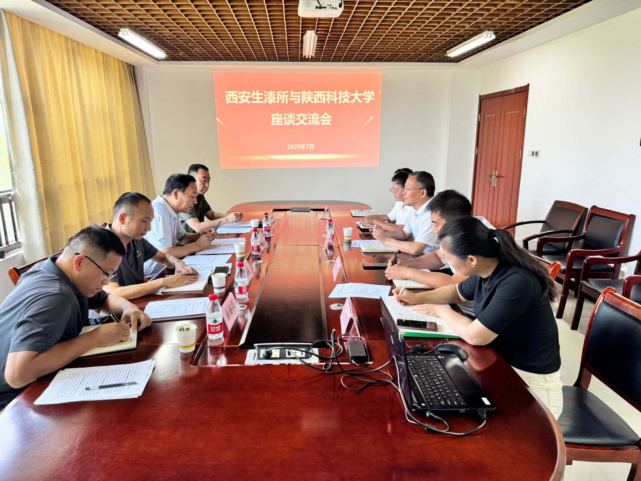 7月14日,陜西科技大學(xué)科技處處長朱建鋒率隊(duì)赴西安生漆涂料研究所開展合作對(duì)接交流,前沿科學(xué)與技術(shù)轉(zhuǎn)移研究院副院長李志如、陜西農(nóng)產(chǎn)品加工技術(shù)研究院主任施春陽及商南東正集團(tuán)董事長任戰(zhàn)洲等一同參加。西安生漆涂料研究所黨委書記、所長趙瑞及相關(guān)負(fù)責(zé)人熱情接待并參與座談。此次交流旨在進(jìn)一步推動(dòng)產(chǎn)學(xué)研深度融合,助力陜西生漆產(chǎn)業(yè)傳承創(chuàng)新與高質(zhì)量發(fā)展。
