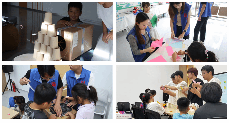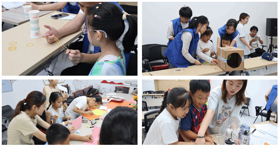 “做中學(xué)”環(huán)節(jié),實(shí)踐團(tuán)將科學(xué)知識(shí)融入趣味實(shí)驗(yàn),如“空氣炮”“紙杯飛機(jī)”“走馬燈”等,吸引孩子們注意力,講解科學(xué)原理,讓科學(xué)變得生動(dòng)。同時(shí)開設(shè)英語、閱讀、手工等課程,助力孩子全面發(fā)展。