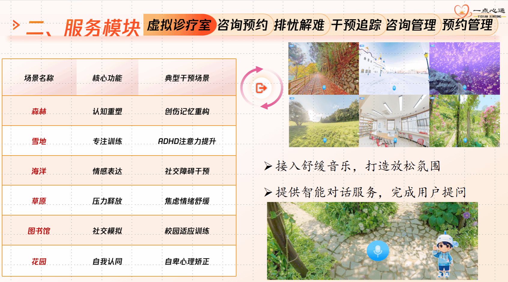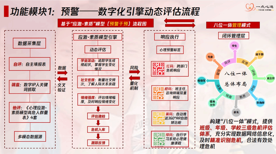 該平臺(tái)通過數(shù)智技術(shù)構(gòu)建了“預(yù)警-服務(wù)-教育”三級(jí)聯(lián)動(dòng)機(jī)制,八大角色前后銜接,協(xié)同構(gòu)建心理健康教育模式閉環(huán)。在預(yù)警模塊,自主研發(fā)“心理危機(jī)篩查核心引擎”,首創(chuàng)心理“應(yīng)激-素質(zhì)”評(píng)估模型,結(jié)合多模態(tài)情緒數(shù)據(jù)監(jiān)測(cè)等技術(shù),實(shí)現(xiàn)心理問題分層預(yù)警及動(dòng)態(tài)實(shí)時(shí)賦碼,解決鄉(xiāng)村心理問題學(xué)生篩不準(zhǔn)困境;在服務(wù)模塊,通過 AR現(xiàn)實(shí)增強(qiáng)技術(shù)創(chuàng)設(shè)6類3D心理干預(yù)場(chǎng)景,打造低成本“沉浸式移動(dòng)心空間”,并搭建隱秘式“排憂解難”論壇,提供專業(yè)的心理問題疏導(dǎo)與咨詢服務(wù),解決心理問題干預(yù)方式低數(shù)字困境;在教育模塊,利用人工智能技術(shù)打造 IP 心理學(xué)伴,集成自然語(yǔ)言處理(NLP)技術(shù)等自動(dòng)觸發(fā)學(xué)伴的主動(dòng)關(guān)懷機(jī)制,同時(shí)攜手心理專家研發(fā)特色網(wǎng)絡(luò)課程,通過開發(fā)項(xiàng)目式課程、案例式課程、游戲式課程,解決心理健康教育缺師資困境,實(shí)現(xiàn)心理問題從精準(zhǔn)預(yù)警到科學(xué)干預(yù)、從教育培訓(xùn)到心理素養(yǎng)提升的全流程服務(wù)?!耙稽c(diǎn)心通”數(shù)字化教育平臺(tái)以中小學(xué)生為核心服務(wù)群體,通過教師、家長(zhǎng)、班主任、德育主任詢師及教育行政部門等八位一體布局,共同擴(kuò)大“一點(diǎn)心通”平臺(tái)使用范圍,形成中小學(xué)心理健康服務(wù)體系。