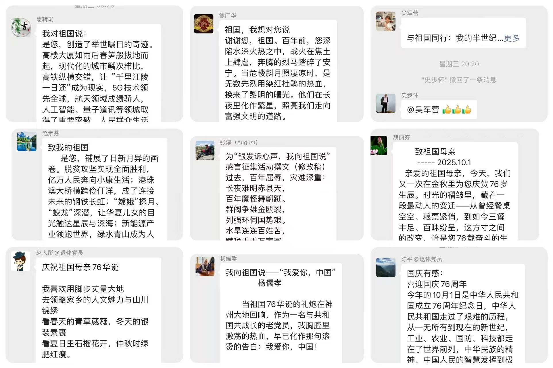 為慶祝中華人民共和國成立76周年,抒發(fā)對祖國的深切熱愛,凝聚銀發(fā)力量,近日,離退處黨委精心組織開展“時(shí)光映照初心,銀齡告白祖國”退休黨員慶國慶感言征集活動(dòng),五十余位退休老黨員積極響應(yīng),以真摯文字訴說家國情懷,用歲月故事詮釋初心使命。