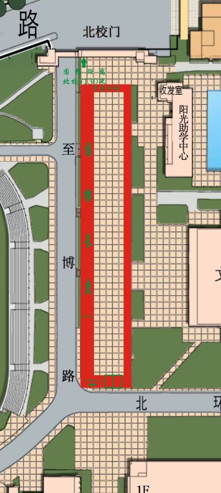 因至博文化長廊項目施工需要,自2023年5月25日起將對教學區(qū)北門以南、至博路以東、文體館以西路段,迎新大道上進行占道封閉圍擋,敬請行人及非機動車遠離圍擋區(qū)域,(施工時間為2023年5月23日至2023年8月30日)圍擋范圍如圖所示: