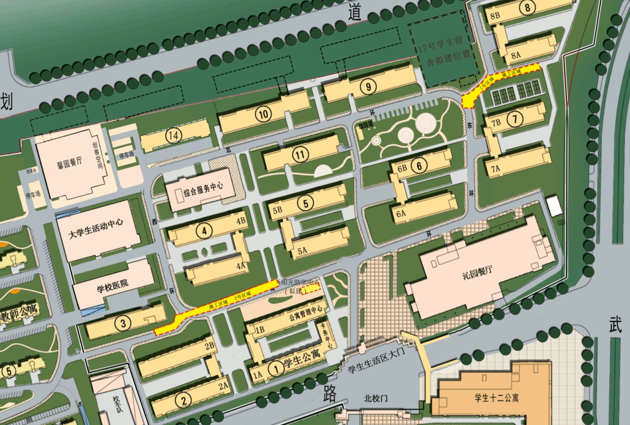 1號區(qū)域為學生8公寓南側道路,封閉施工時間為10月16日上午7:00,解除封閉時間為10月20日下午5:00。