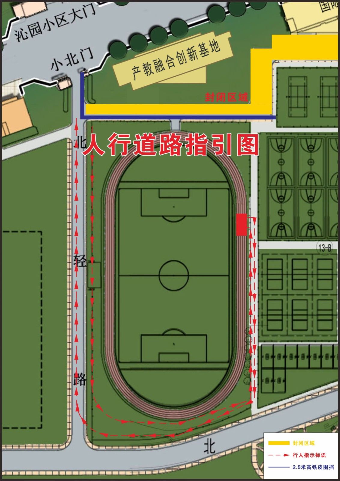 封閉期間,進(jìn)出田徑場需臨時(shí)繞行至球場東入口,從封閉口西端前往餐廳需經(jīng)北輕路、北環(huán)路臨時(shí)繞行第二田徑場東側(cè)道路。