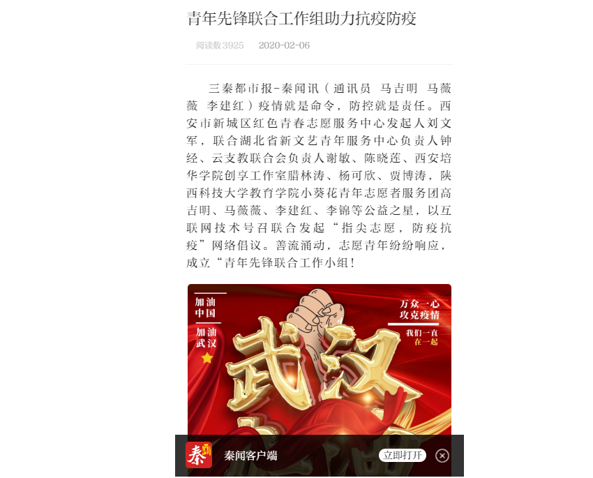 近日,《三秦都市報》APP報道我校年志愿者等成立青年先鋒聯(lián)合工作組助力抗疫防疫。