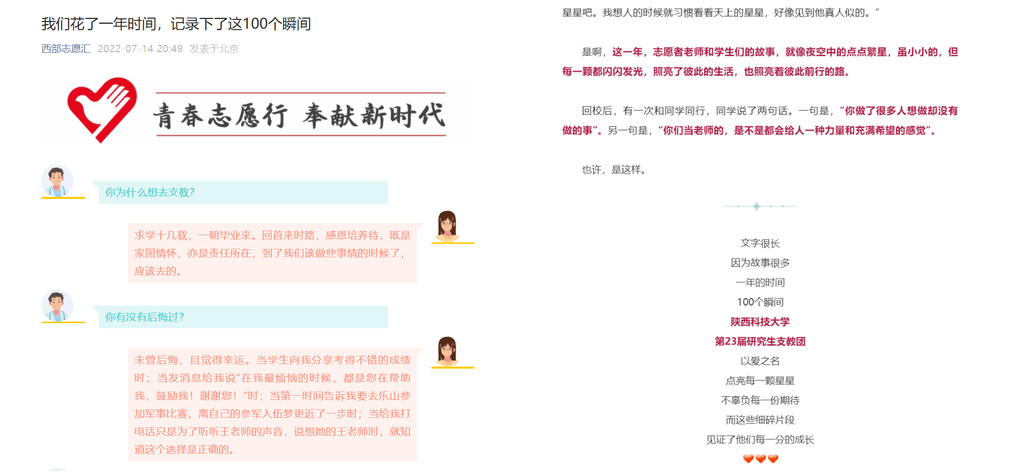 近日,全國西部計劃項目辦“西部志愿匯”報道了我校第22屆研究生支教團王婉妮花一年時間記錄的支教生活中的100個瞬間。