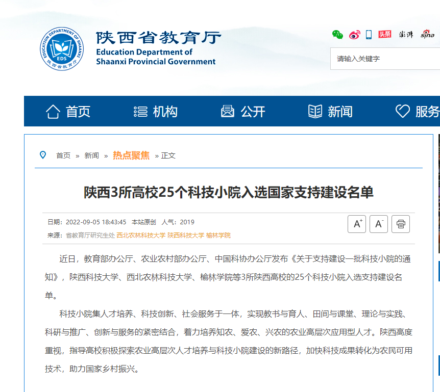 近日,陜西省教育廳官網(wǎng)、西安發(fā)布報道我??萍夹≡喝脒x選國家支持建設科技小院名單。
