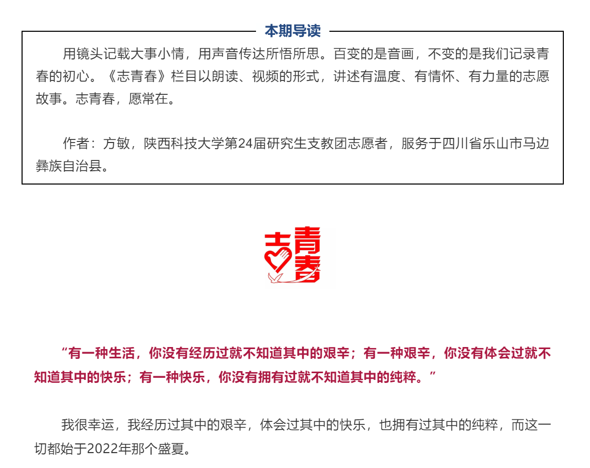 近日,“中國(guó)青年志愿者”微信公眾號(hào)刊發(fā)我校第24屆研究生支教團(tuán)志愿者方敏的志愿故事。