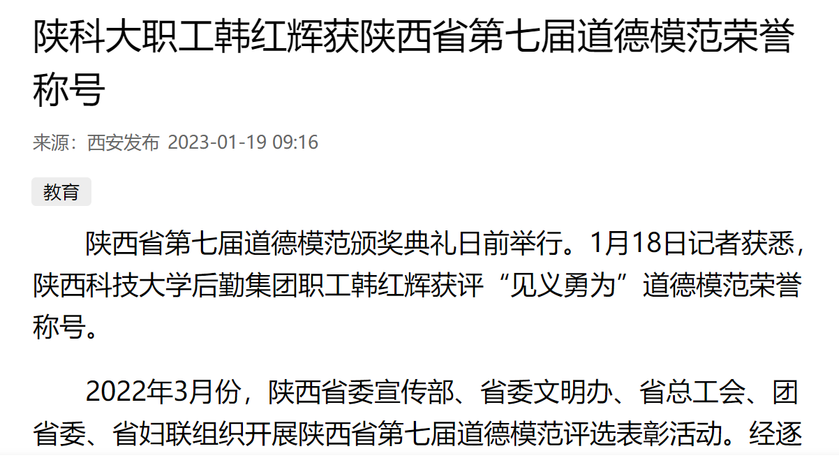 西安發(fā)布:陜科大職工韓紅輝獲陜西省第七屆道德模范榮譽稱號