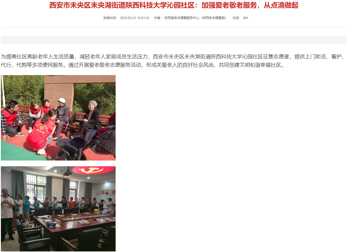 《陜西老年健康報(bào)》:西安市未央?yún)^(qū)未央湖街道陜西科技大學(xué)沁園社區(qū):加強(qiáng)愛老敬老服務(wù),從點(diǎn)滴做起