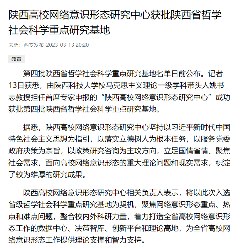 西安發(fā)布:陜西高校網(wǎng)絡意識形態(tài)研究中心獲批陜西省哲學社會科學重點研究基地