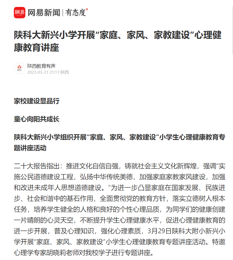 網(wǎng)易新聞:陜科大新興小學(xué)開(kāi)展“家庭、家風(fēng)、家教建設(shè)”心理健康教育講座