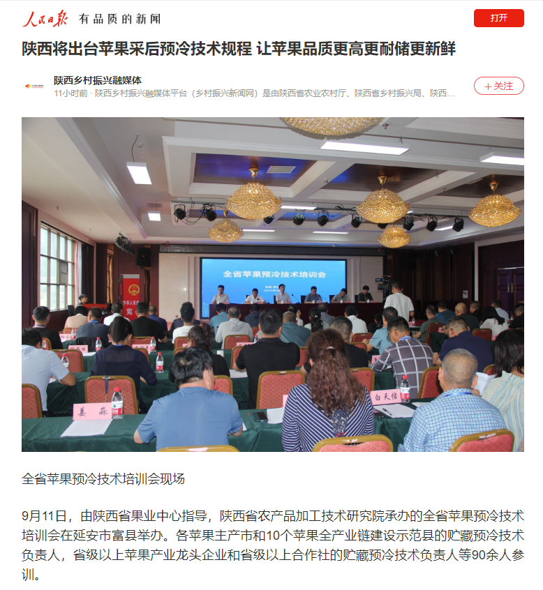 近日,《人民日?qǐng)?bào)》APP、騰訊網(wǎng)、陜西省果業(yè)中心官方微信公眾號(hào)、網(wǎng)易新聞報(bào)道陜西農(nóng)產(chǎn)品加工技術(shù)研究院承辦全省蘋(píng)果預(yù)冷技術(shù)培訓(xùn)會(huì)。