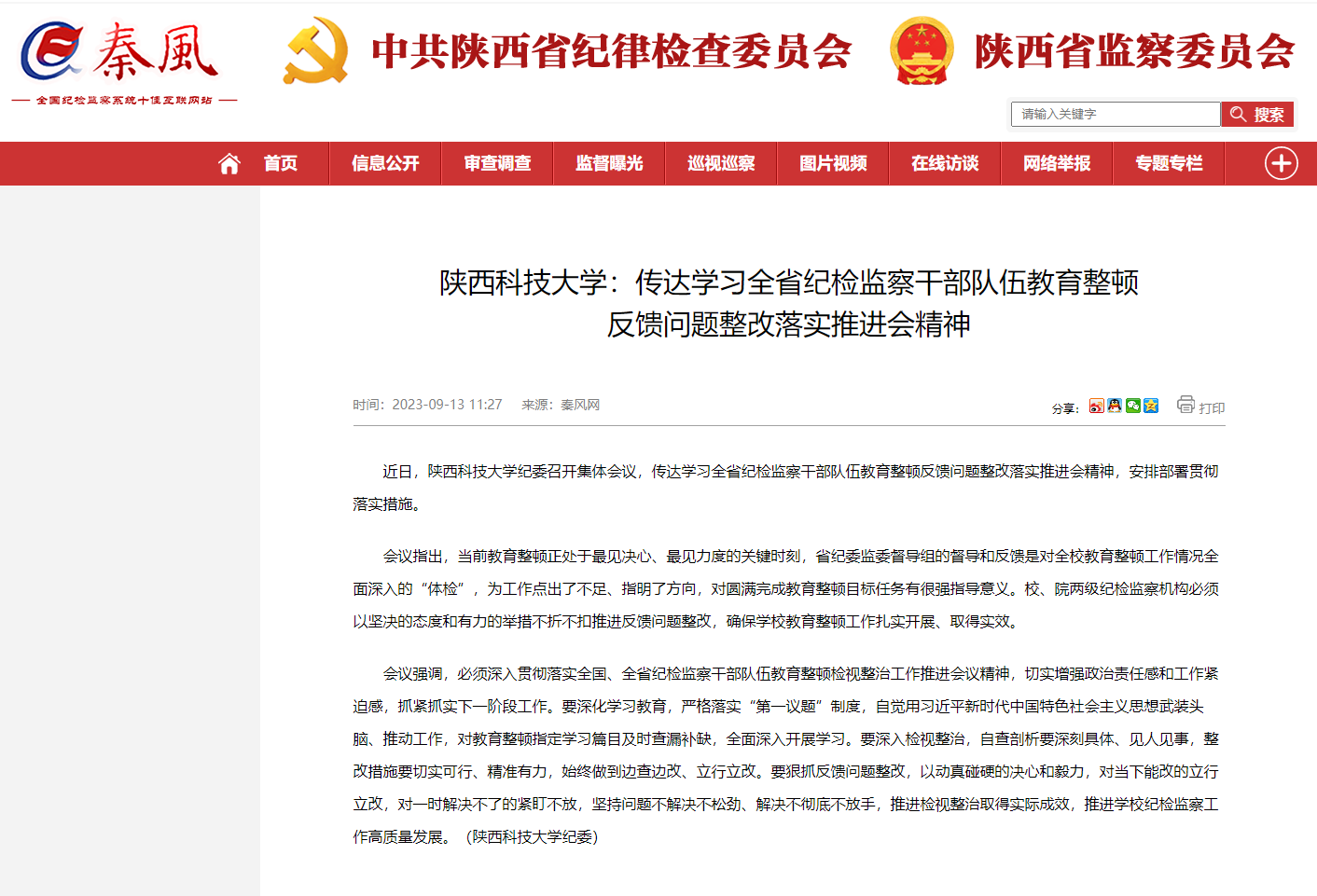 近日,秦風(fēng)網(wǎng)報(bào)道我校傳達(dá)學(xué)習(xí)全省紀(jì)檢監(jiān)察干部隊(duì)伍教育整頓反饋問(wèn)題整改落實(shí)推進(jìn)會(huì)精神。