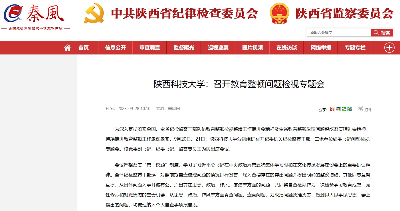 近日,秦風(fēng)網(wǎng)報道我校召開教育整頓問題檢視專題會。