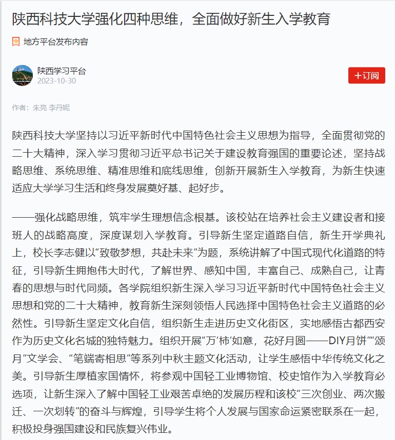 學習強國陜西學習平臺:陜西科技大學強化四種思維,全面做好新生入學教育