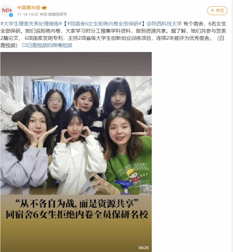 中國(guó)青年報(bào)官方微博:同宿舍6女生拒絕內(nèi)卷全員保研