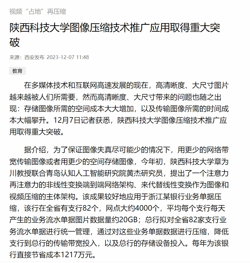 西安發(fā)布:陜西科技大學圖像壓縮技術推廣應用取得重大突破