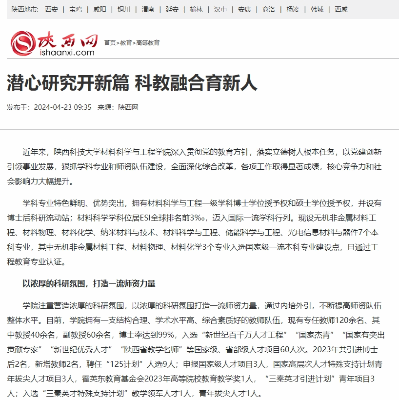 陜西網(wǎng)報(bào)道我校材料學(xué)院潛心研究開新篇,科教融合育新人。