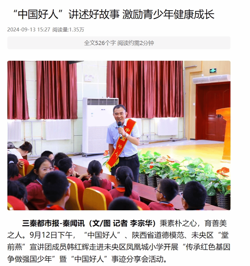 近日,秦聞報(bào)道我?!爸袊?guó)好人”韓紅輝講述好故事 激勵(lì)青少年健康成長(zhǎng)。