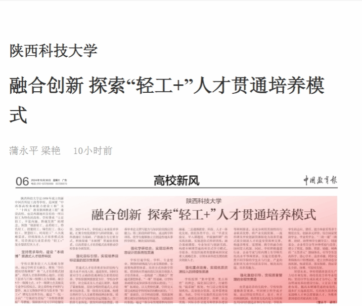 近日,《中國(guó)教育報(bào)》報(bào)道我校融合創(chuàng)新,探索“輕工+”人才貫通培養(yǎng)模式。