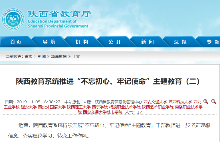 11月5日,陜西省教育廳官網(wǎng)報道了我校“不忘初心、牢記使命”主題教育,全文鏈接如下:http://jyt.shaanxi.gov.cn/jynews/rdjj/201911/05/94330.html