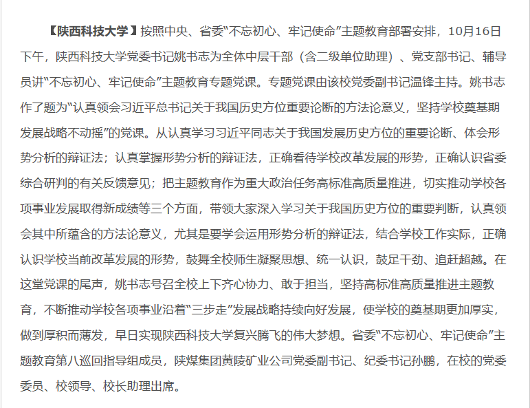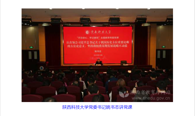 【陜西科技大學(xué)】按照中央、省委“不忘初心、牢記使命”主題教育部署安排,10月16日下午,陜西科技大學(xué)黨委書記姚書志為全體中層干部(含二級單位助理)、黨支部書記、輔導(dǎo)員講“不忘初心、牢記使命”主題教育專題黨課。專題黨課由該校黨委副書記溫鋒主持。姚書志作了題為“認(rèn)真領(lǐng)會習(xí)近平總書記關(guān)于我國歷史方位重要論斷的方法論意義,堅持學(xué)校奠基期發(fā)展戰(zhàn)略不動搖”的黨課。從認(rèn)真學(xué)習(xí)習(xí)近平同志關(guān)于我國發(fā)展歷史方位的重要論斷、體會形勢分析的辯證法;認(rèn)真掌握形勢分析的辯證法,正確看待學(xué)校改革發(fā)展的形勢,正確認(rèn)識省委綜合研判的有關(guān)反饋意見;把主題教育作為重大政治任務(wù)高標(biāo)準(zhǔn)高質(zhì)量推進(jìn),切實推動學(xué)校各項事業(yè)發(fā)展取得新成績等三個方面,帶領(lǐng)大家深入學(xué)習(xí)關(guān)于我國歷史方位的重要判斷,認(rèn)真領(lǐng)會其中所蘊(yùn)含的方法論意義,尤其是要學(xué)會運用形勢分析的辯證法,結(jié)合學(xué)校工作實際,正確認(rèn)識學(xué)校當(dāng)前改革發(fā)展的形勢,鼓舞全校師生凝聚思想、統(tǒng)一認(rèn)識,鼓足干勁、追趕超越。在這堂黨課的尾聲,姚書志號召全校上下齊心協(xié)力、敢于擔(dān)當(dāng),堅持高標(biāo)準(zhǔn)高質(zhì)量推進(jìn)主題教育,不斷推動學(xué)校各項事業(yè)沿著“三步走”發(fā)展戰(zhàn)略持續(xù)向好發(fā)展,使學(xué)校的奠基期更加厚實,做到厚積而薄發(fā),早日實現(xiàn)陜西科技大學(xué)復(fù)興騰飛的偉大夢想。省委“不忘初心、牢記使命”主題教育第八巡回指導(dǎo)組成員,陜煤集團(tuán)黃陵礦業(yè)公司黨委副書記、紀(jì)委書記孫鵬,在校的黨委委員、校領(lǐng)導(dǎo)、校長助理出席。