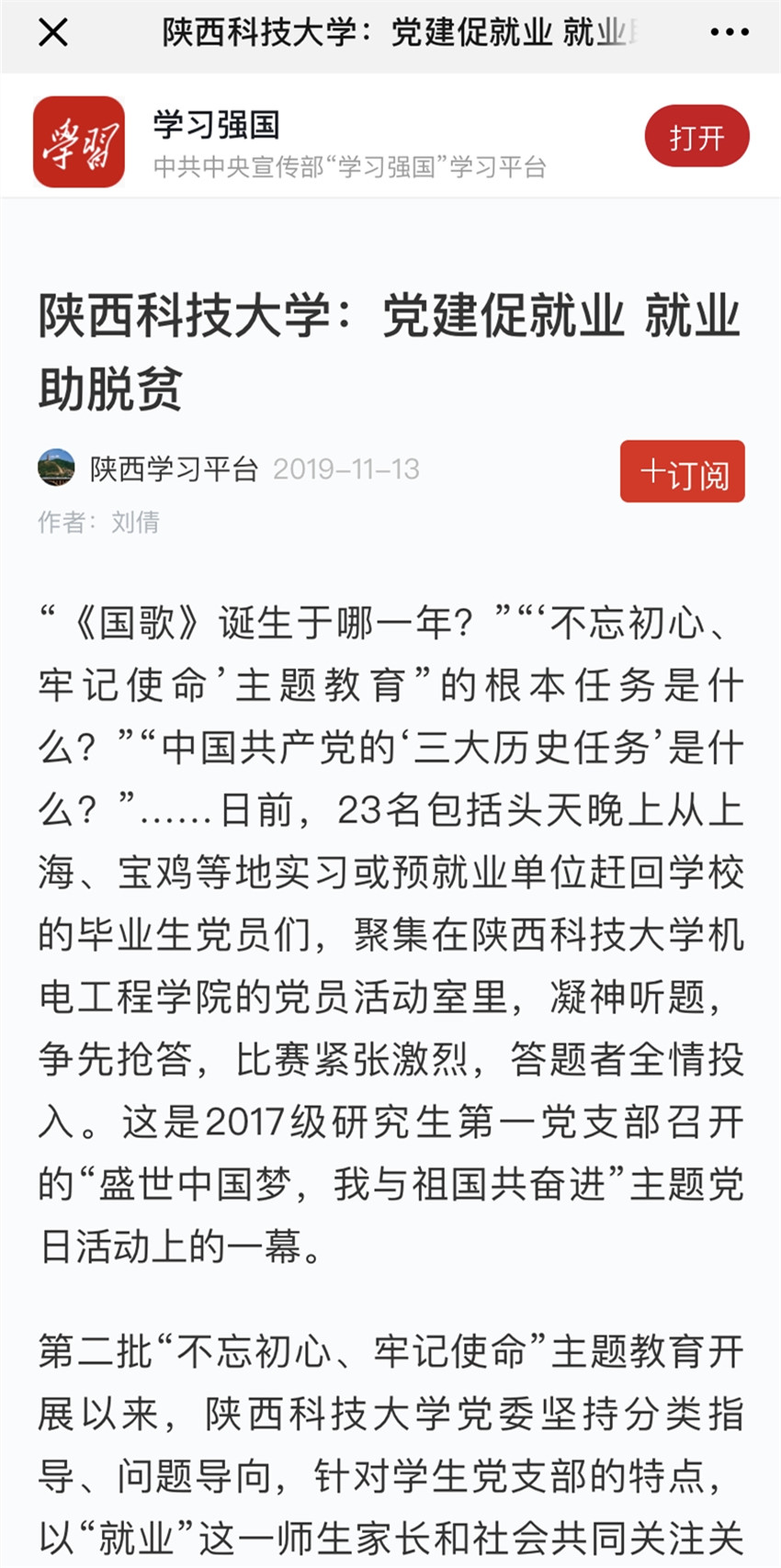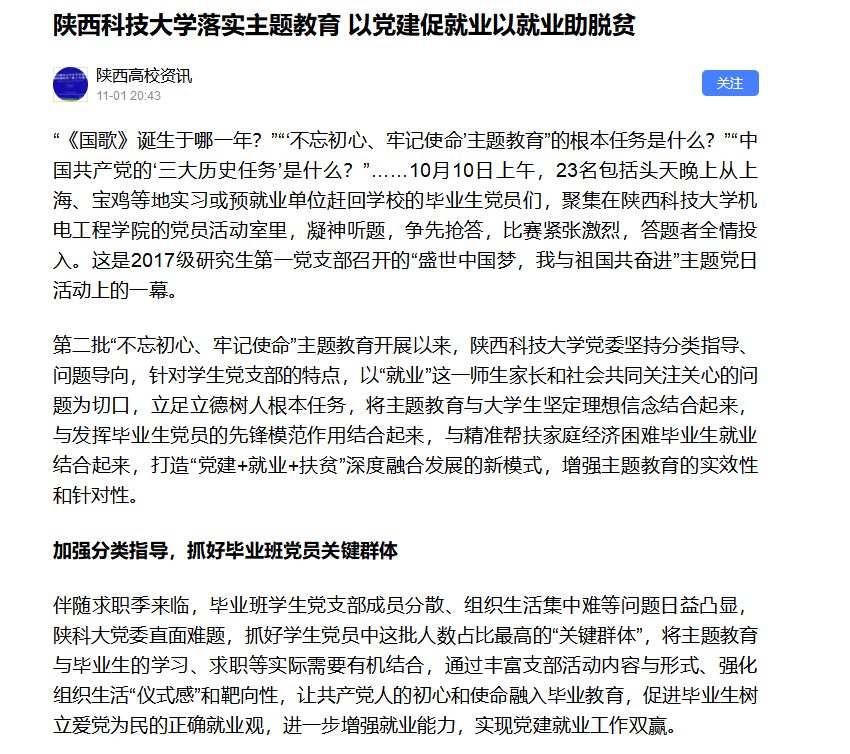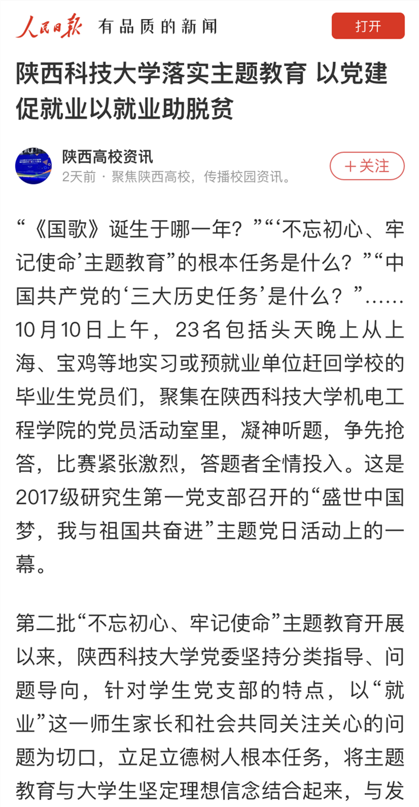 人民日報APP:陜西科技大學落實主題教育 以黨建促就業(yè)以就業(yè)助脫貧