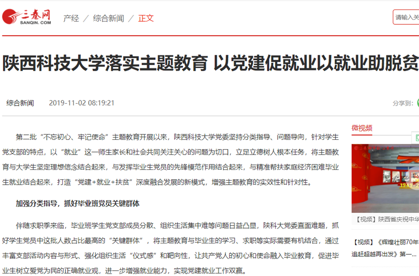 三秦網(wǎng):陜西科技大學落實主題教育 以黨建促就業(yè)以就業(yè)助脫貧