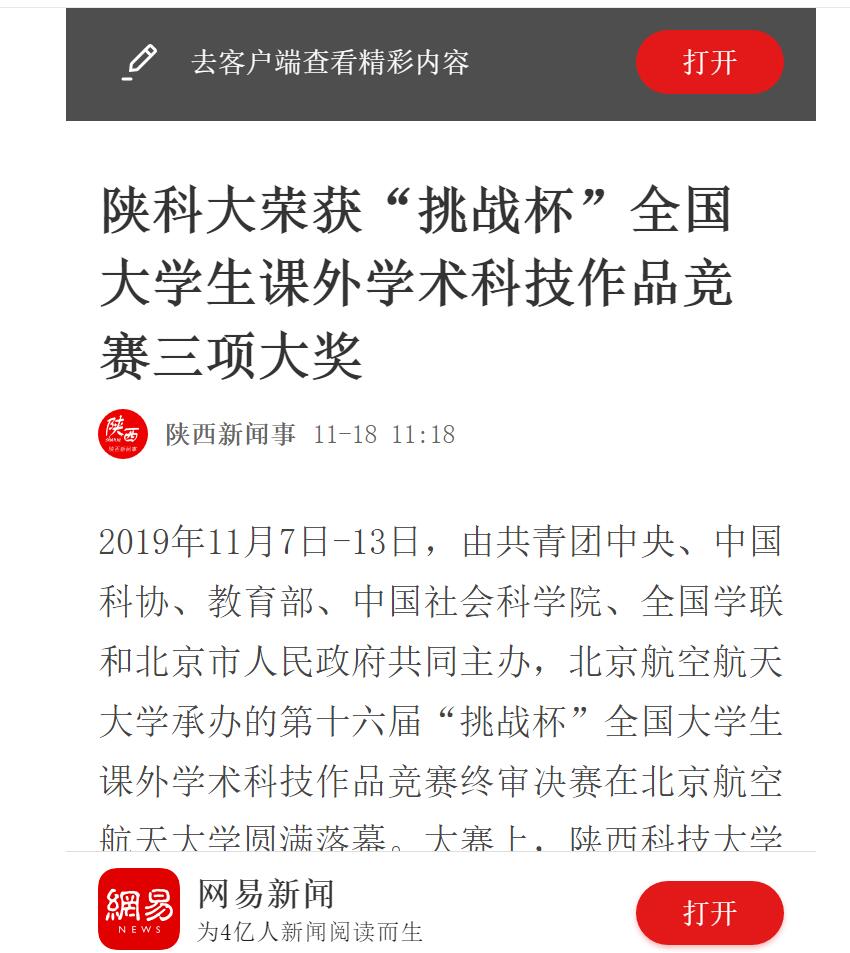 網(wǎng)易新聞:陜科大榮獲“挑戰(zhàn)杯”全國(guó)大學(xué)生課外學(xué)術(shù)科技作品競(jìng)賽三項(xiàng)大獎(jiǎng)