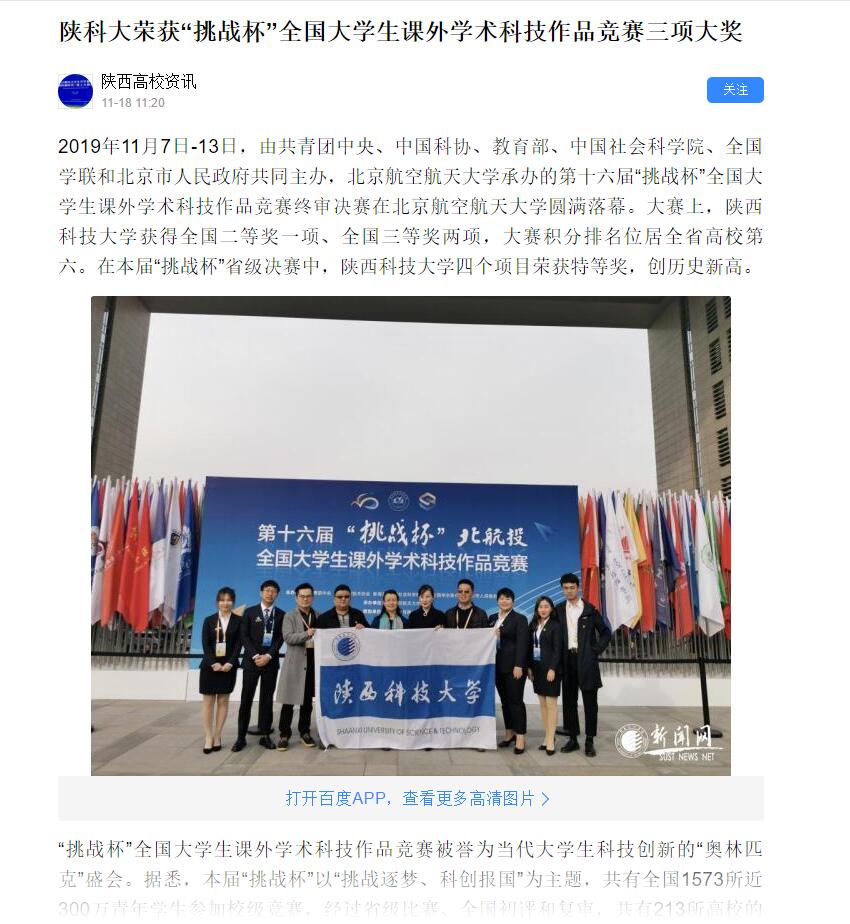 百度APP:陜科大榮獲“挑戰(zhàn)杯”全國(guó)大學(xué)生課外學(xué)術(shù)科技作品競(jìng)賽三項(xiàng)大獎(jiǎng)