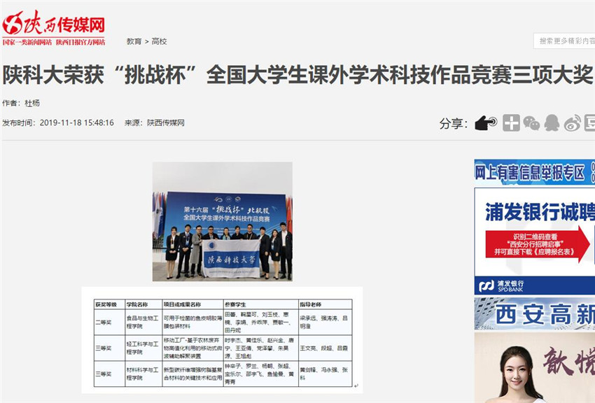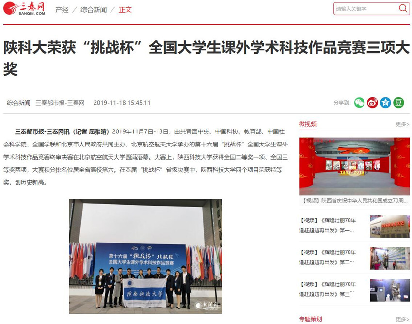 三秦網(wǎng):陜科大榮獲“挑戰(zhàn)杯”全國(guó)大學(xué)生課外學(xué)術(shù)科技作品競(jìng)賽三項(xiàng)大獎(jiǎng)