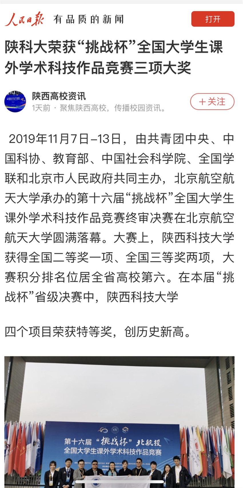 人民日?qǐng)?bào)APP:陜科大榮獲“挑戰(zhàn)杯”全國(guó)大學(xué)生課外學(xué)術(shù)科技作品競(jìng)賽三項(xiàng)大獎(jiǎng)