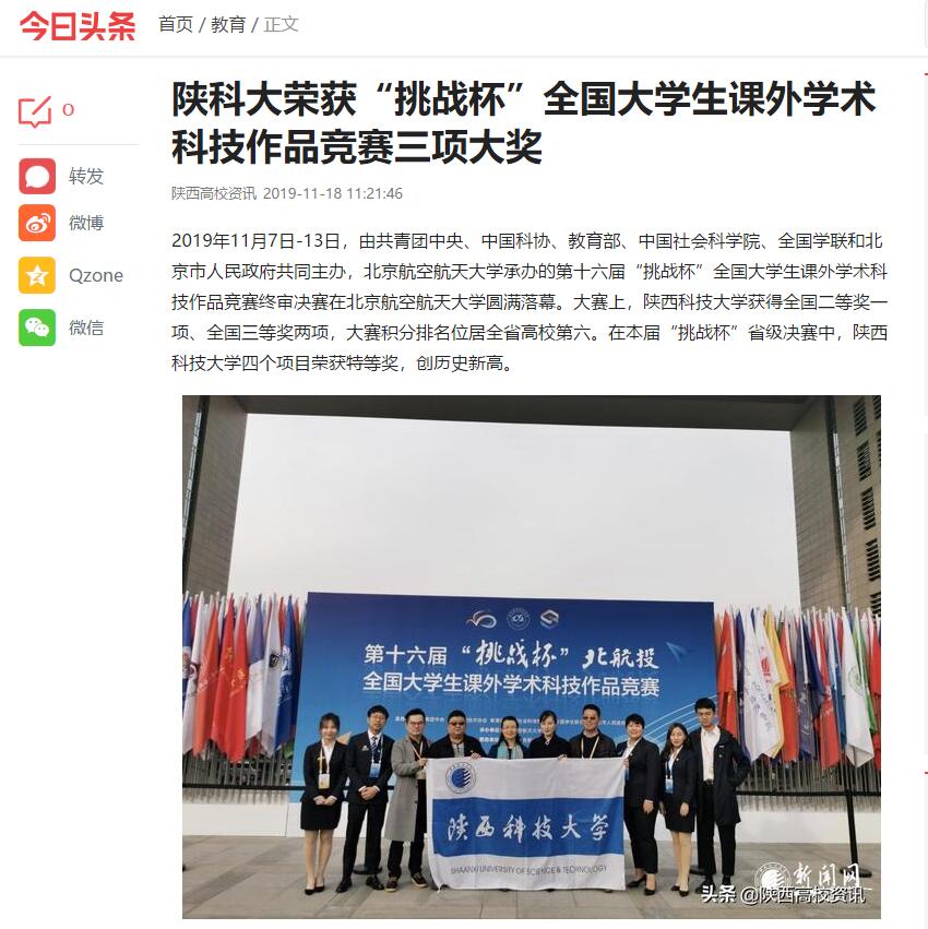 今日頭條APP:陜科大榮獲“挑戰(zhàn)杯”全國(guó)大學(xué)生課外學(xué)術(shù)科技作品競(jìng)賽三項(xiàng)大獎(jiǎng)