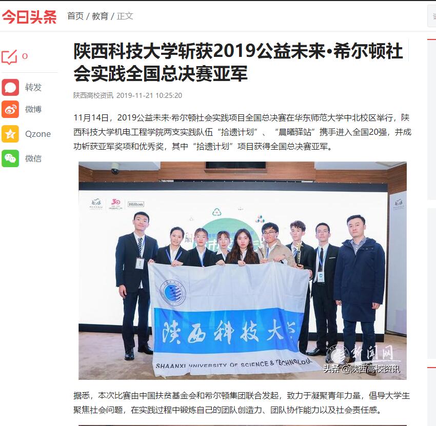 今日頭條:陜西科技大學(xué)斬獲2019公益未來(lái)·希爾頓社會(huì)實(shí)踐全國(guó)總決賽亞軍