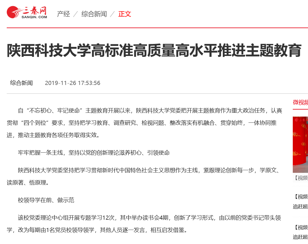 三秦網(wǎng):陜西科技大學(xué)高標(biāo)準(zhǔn)高質(zhì)量高水平推進(jìn)主題教育