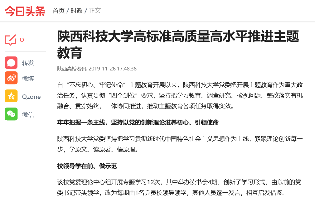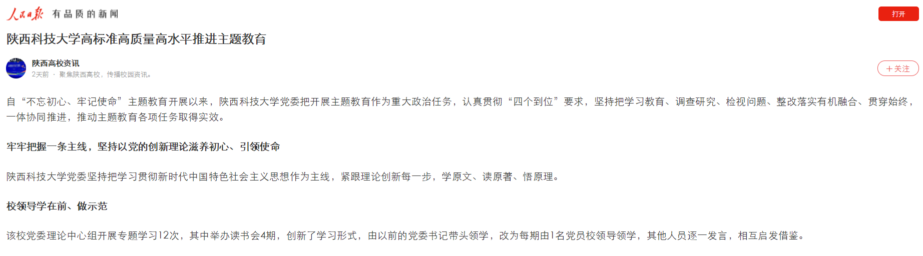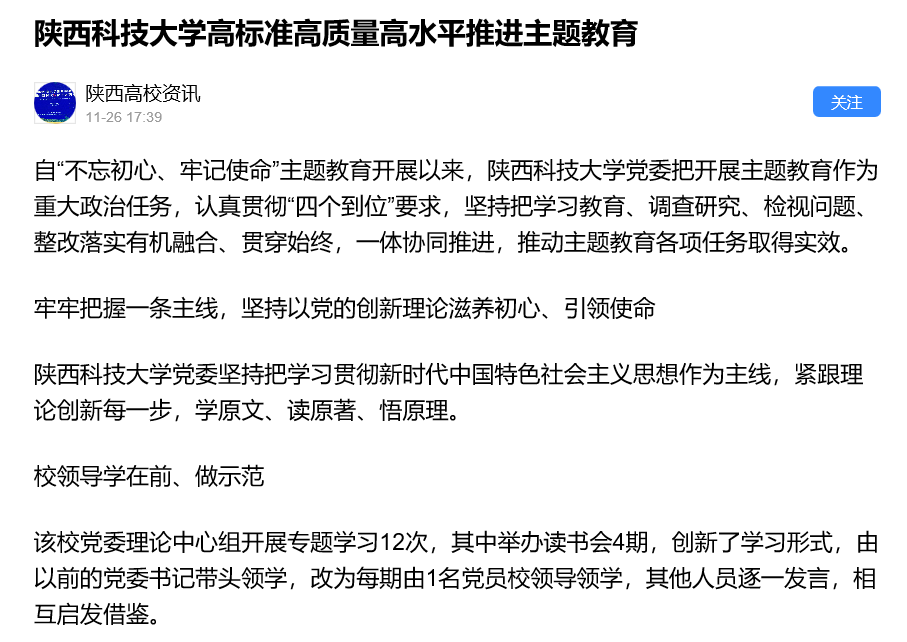 今日頭條:陜西科技大學(xué)高標(biāo)準(zhǔn)高質(zhì)量高水平推進(jìn)主題教育