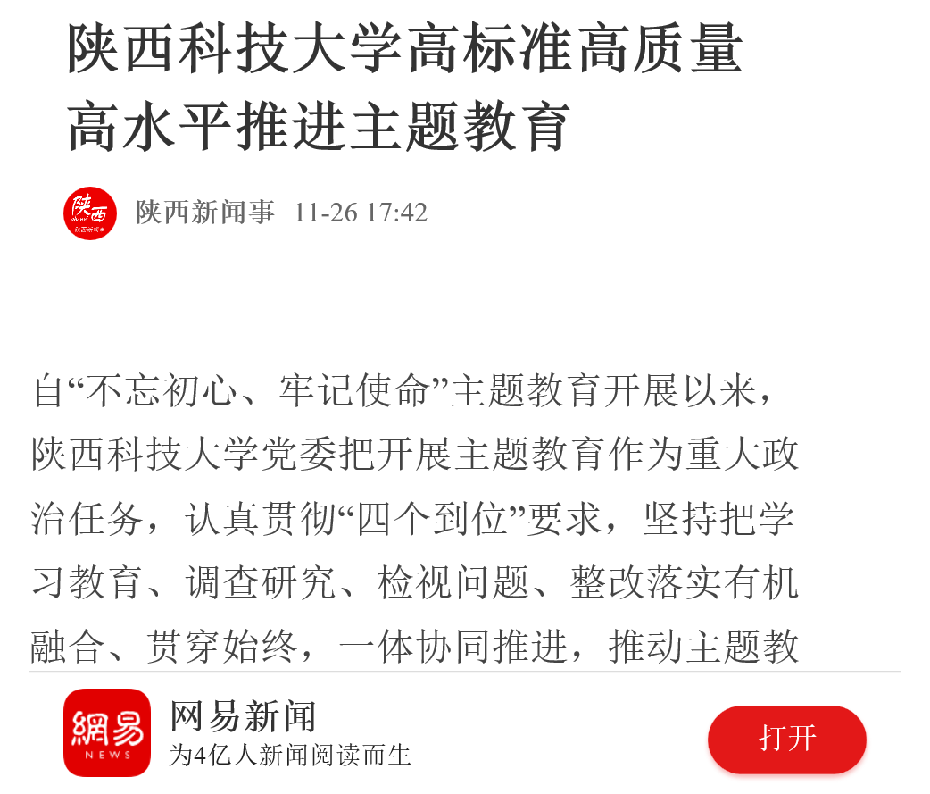 網(wǎng)易新聞:陜西科技大學(xué)高標(biāo)準(zhǔn)高質(zhì)量高水平推進(jìn)主題教育