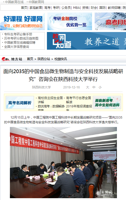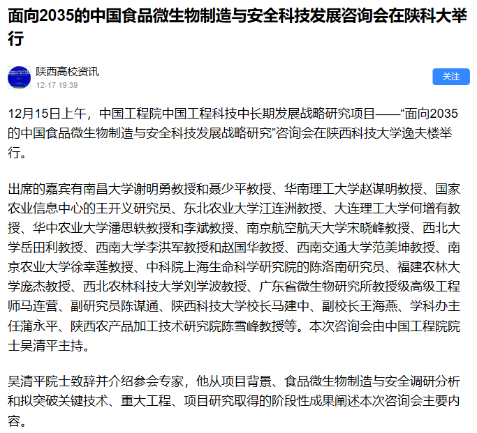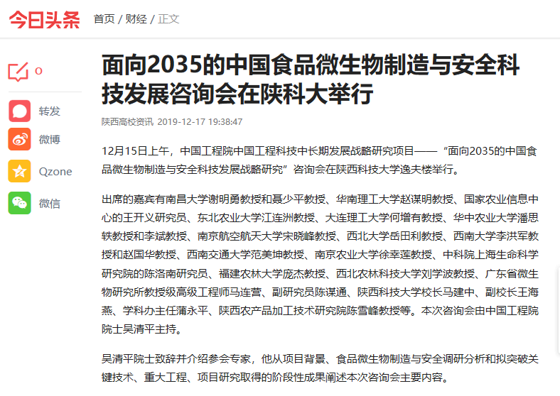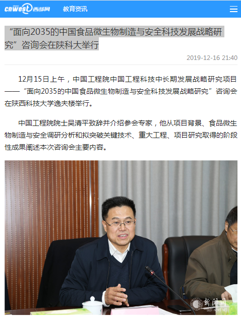 近日,中國教育網(wǎng)、西部網(wǎng)、今日頭條等媒體紛紛報道面向2035的中國食品微生物制造與安全科技發(fā)展戰(zhàn)略研究”咨詢會在陜西科技大學舉行。