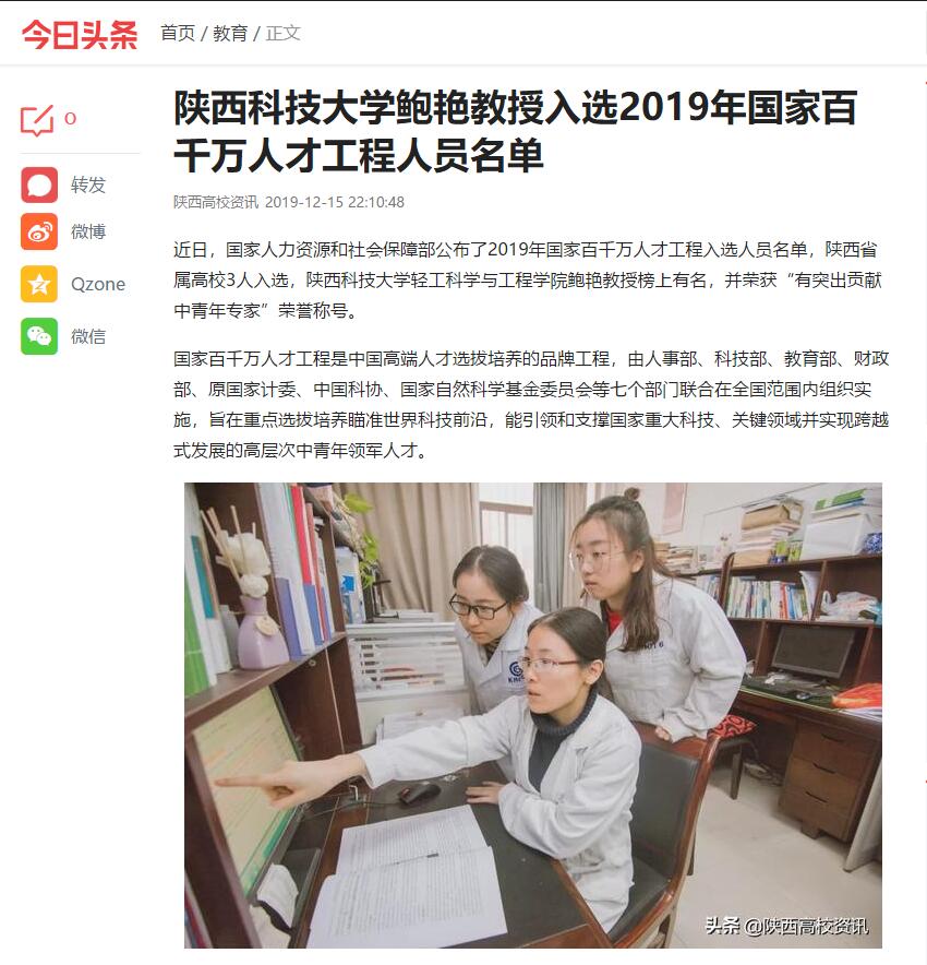 網(wǎng)易新聞:陜西科技大學(xué)鮑艷教授入選2019年國家百千萬人才工程人員名單