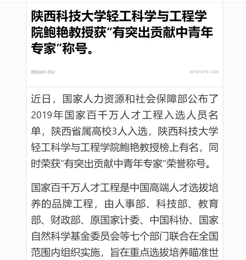 搜狐新聞:陜西科技大學(xué)輕工科學(xué)與工程學(xué)院鮑艷教授獲“有突出貢獻(xiàn)中青年專家”稱號