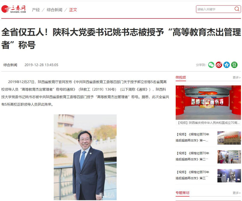 三秦網(wǎng):全省僅五人!陜科大黨委書記姚書志被授予“高等教育杰出管理者”稱號