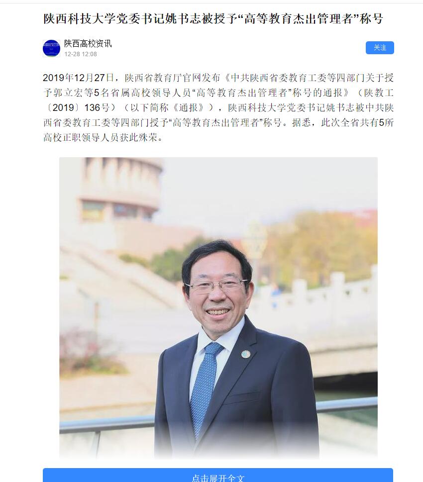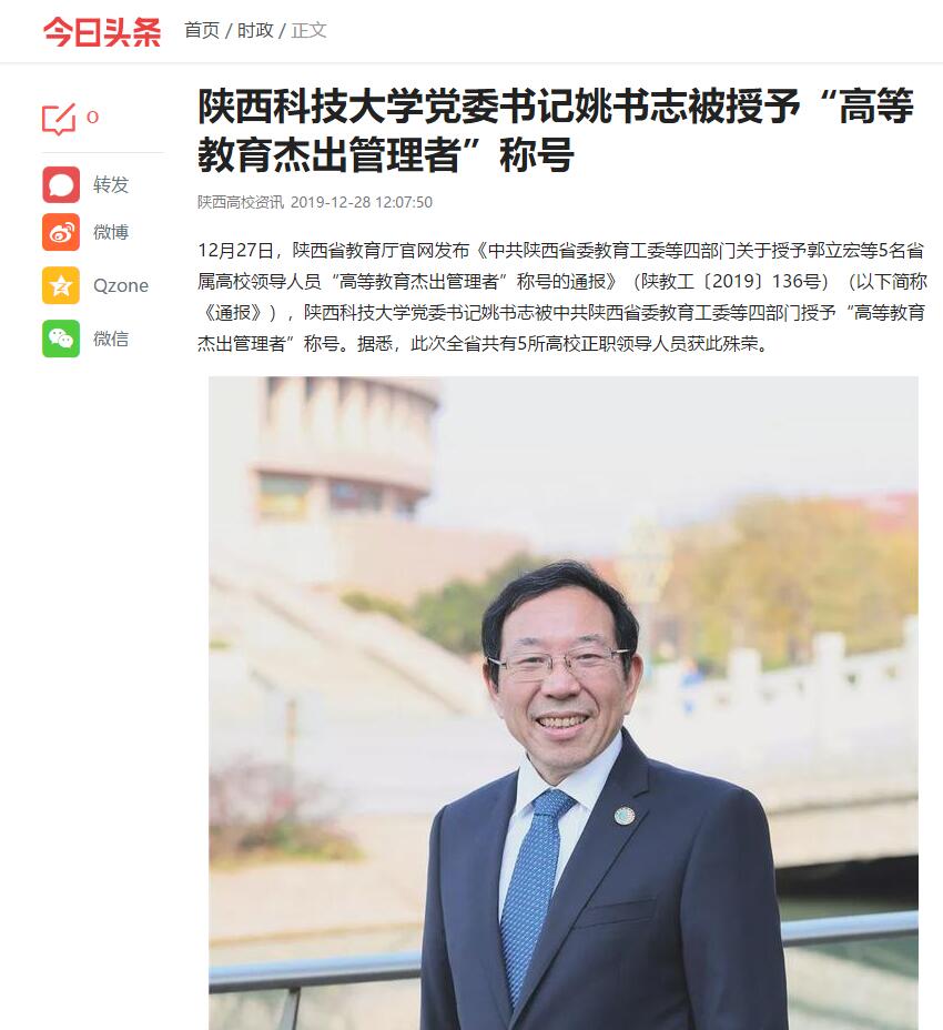 今日頭條APP:陜西科技大學黨委書記姚書志被授予“高等教育杰出管理者”稱號