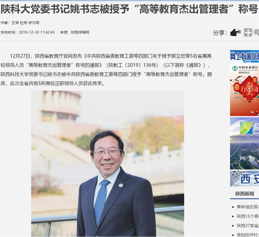 陜西傳媒網(wǎng):陜科大黨委書記姚書志被授予“高等教育杰出管理者”稱號