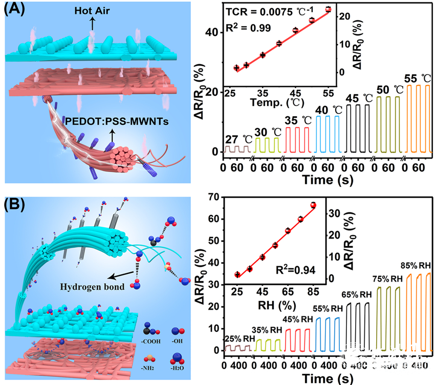 王學川教授領(lǐng)銜的生物質(zhì)與功能材料研究所長期以來一直致力于基于動物生物質(zhì)膠原及其水解物復合功能材料的研究開發(fā),該論文結(jié)合國家重點發(fā)展的柔性電子智能材料,以膠原基質(zhì)為原料構(gòu)建了多功能柔性傳感材料,為典型的跨學科交叉技術(shù)應(yīng)用,為擴寬我校輕工學科內(nèi)涵發(fā)展提供支撐。目前,實現(xiàn)柔性傳感器的生物相容性、可穿戴性、高分辨、高靈敏、低成本制造和復雜信號檢測等功能集成仍是該領(lǐng)域的重大挑戰(zhàn)。本研究以天然皮膠原為結(jié)構(gòu)基板,不同功能屬性的導電材料為物理摻雜導電構(gòu)筑單元,通過靜電紡絲技術(shù)制備雙層仿生全纖維結(jié)構(gòu)的多功能集成電子皮膚。其基于納米摩擦發(fā)電機理論,兼具自發(fā)電(壓力)、溫度和濕度檢測功能,且具有極高的壓力敏感性和寬檢測范圍、較短的濕度響應(yīng)/恢復時間、優(yōu)異的電阻溫度系數(shù)。此外,基于低成本、生物相容、透氣性好和可生物降解的優(yōu)勢,使其可廣泛應(yīng)用于智能機器人、交互式可穿戴設(shè)備和人工義肢等領(lǐng)域。該研究對生物質(zhì)膠原高值資源化及生物相容性功能集成柔性傳感材料發(fā)展具有重要的科學研究意義和應(yīng)用推廣價值。
