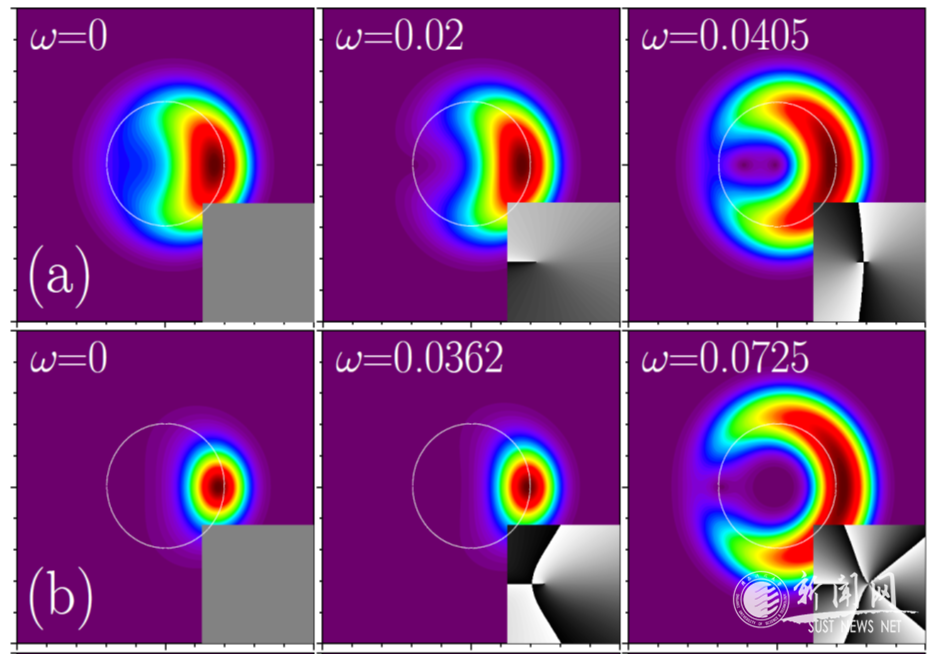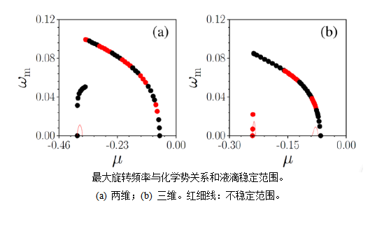 該研究基于失諧勢調(diào)制的李-黃-楊修正超平均場GP方程,發(fā)現(xiàn)了新型雙組份BECs中持續(xù)旋轉(zhuǎn)的超稀量子液滴。這類液滴類似于非線性作用導致的徑向局域化的回音壁模式。隨著化學勢和旋轉(zhuǎn)頻率的變化,液滴呈現(xiàn)出豐富多樣的形狀。從幾乎平頂?shù)綇娏覂A斜的局域波包,延伸到幾乎整個極角范圍的新月形液滴。臨界旋轉(zhuǎn)頻率處的液滴轉(zhuǎn)變?yōu)闇u旋液滴(二維)或渦環(huán)液滴(三維),其拓撲指數(shù)隨化學勢絕對值的增加而增大。旋轉(zhuǎn)量子液滴幾乎在其整個存在區(qū)間內(nèi)都很穩(wěn)定。它們是基階和渦旋量子液滴之間的一類基于對稱破缺的新型過渡態(tài)。該研究得到陜西省高層次人才項目、陜西省自然科學基金和我??蒲袉禹椖康闹С?。