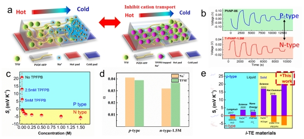 (a) P-N型轉(zhuǎn)換調(diào)控示意圖,(b)電壓響應(yīng)方向?qū)Ρ葓D,(c)P型至N型塞貝克系數(shù)變化圖,(d)P型和N型離子產(chǎn)生熵變圖,(e)已報(bào)道的P-N型塞貝克系數(shù)范圍對(duì)比圖。