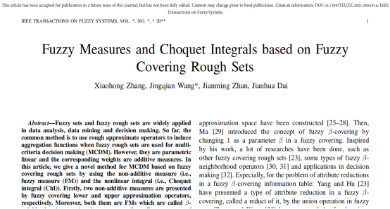 [1]Xiaohong Zhang, Jingqian Wang*, Jianming Zhan, Jianhua Dai, Fuzzy measures and Choquet integrals based on fuzzy covering rough sets, IEEE Transactions on Fuzzy Systems, 2021, DOI:10.1109/TFUZZ.2021.3081916.